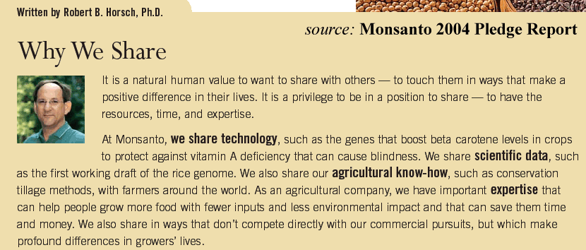 DNA patent-holders routinely let researchers use “their” DNA in experiments, but reserve the right to profit from (or block development of) commercial products. In 2000, with an enormous image problem on its hands and meanwhile with Golden Rice on the cover of Time, Monsanto agreed to forego any share of the profits from this rice. It’s doubtful they would have made any money on this crop anyway, especially since the 35S viral promoter was soon replaced with a plant promoter. But for the “altruistic” act of giving up non-existent profits on a rice for the poor, Monsanto launched a shameless PR campaign in which they essentially took credit for actually developing Golden Rice: