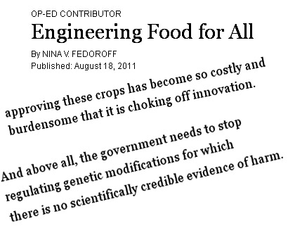 The NY Times recently published “Engineering Food for All,” a gushing op-ed by professional GMO proponent Nina Fedoroff that bemoaned the increasingly burdensome regulatory oversight of GM crops.  She went so far as to link world hunger to regulation of GMO’s.