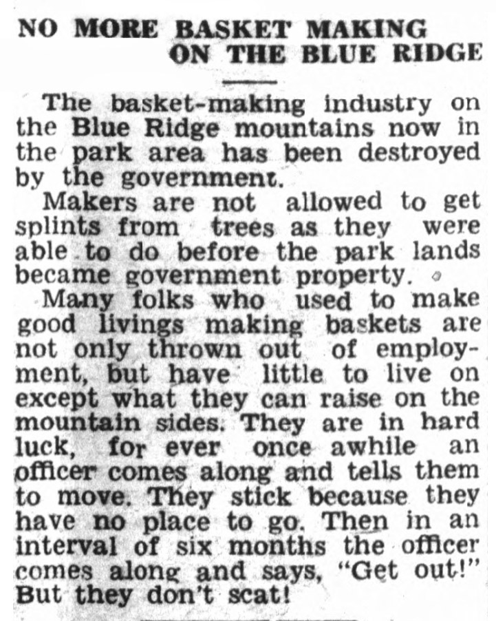 Then the already deteriorating conditions got much worse as park officials began to tightly regulate the activities of families remaining in the park area. Hunting was banned; so was baskets making. When children from the hollows tried to sell flowers on the new Skyline Drive, parents were ordered to keep them home.