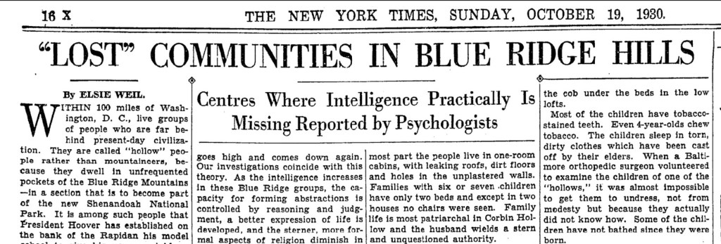 In this act they became celebrities. The national press seized on their shabby cabins and thick accents to spin lurid stories of poverty, isolation, and cultural backwardness. They were a described as Rip Van Winkle culture in a time warp just two hours from the nation’s capital, only recently “discovered” by a group of hikers. They had “no experience in farming” and their children had never tasted milk, played with toys, or heard of Santa Claus. They spoke a “queer Chaucerian English.”