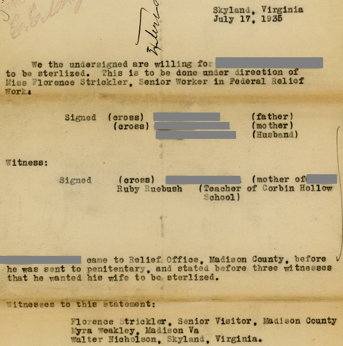 The process of sterilizing Corbins was underway before they were evicted from the hollow. The image of a Corbin woman in the Post article (above) was cropped from a photo showing her beside her 17-year-old daughter, who had recently married a young man from another hollow. A few months before the photo was taken, the social worker Florence Strickler had started the paperwork for the girl’s commitment and sterilization, obtaining “X” marks on approval forms from the girl’s illiterate parents and husband — who certainly had not really intended that the new bride would be rendered sterile.