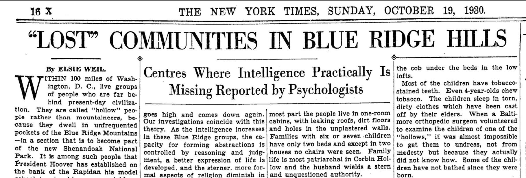 And there was something seriously wrong with these folks. In this “lost community”, The New York Times explained, “intelligence practically is missing”. In 1933 the scientific monograph Hollow Folk pronounced the Corbins as exhibiting “the lowest level of social development”, apparently the result of that missing intelligence.